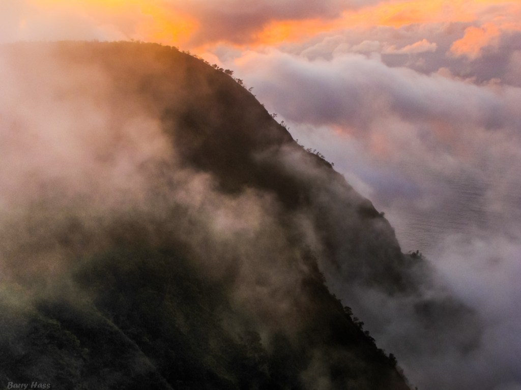 Na Pali is the name of the northwest coast of Kauai, a stunningly beautiful area of high sea cliffs covered with lush vegetation, and cut by deep, narrow valleys and waterfalls. Insatiable sunset chasers that we are, we decided to take the long, twisty road up to Kalalau Lookout one evening, to see the sun set over the ocean from the top of the cliffs. Unfortunately, when we got there, a dense, cottony mist had settled on the coast, completely obliterating the view. We waited around a few minutes, and were about to drive back down, when magically, the wind picked up and the clouds parted just long enough for me to take this shot.