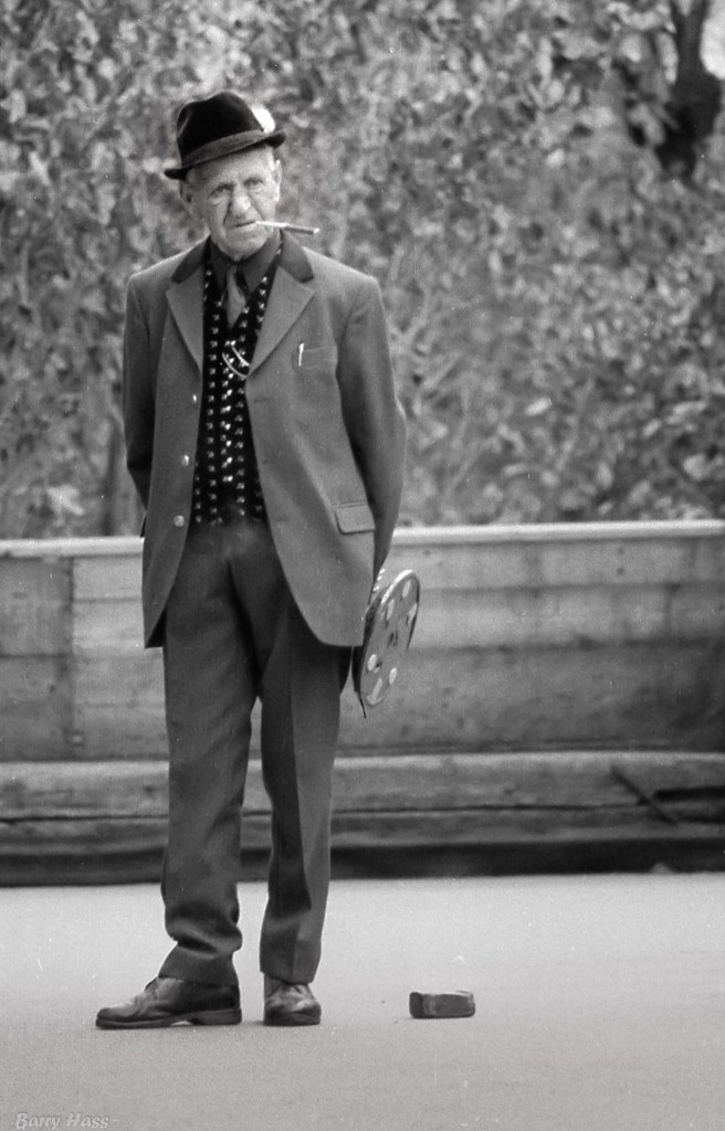 This gentleman is deep into a game of Eisstockschiessen, also called Bavarian curling, which is played on asphalt during non-winter months. I took this shot in Zell am See, Austria in 1971.