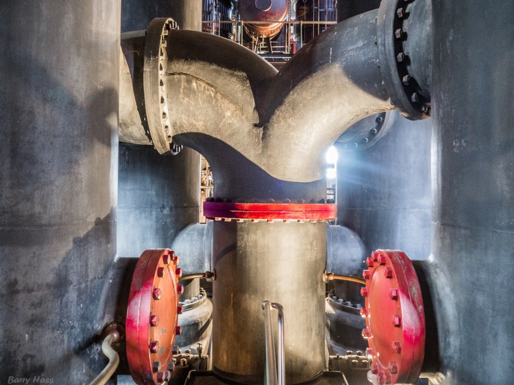 I paid a visit yesterday to the Boston Waterworks Museum, the main pumping station for the Metro Boston water system from the 1890s to the 1970s. It’s a fascinating and impressive collection of massive machines and plumbing. There are three pumps, each about three stories high. The largest of them extends two stories below ground as well. The pumps were all steam powered, the steam produced in coal fired boilers. This picture shows some of the steam pipes for the oldest of the pumps.