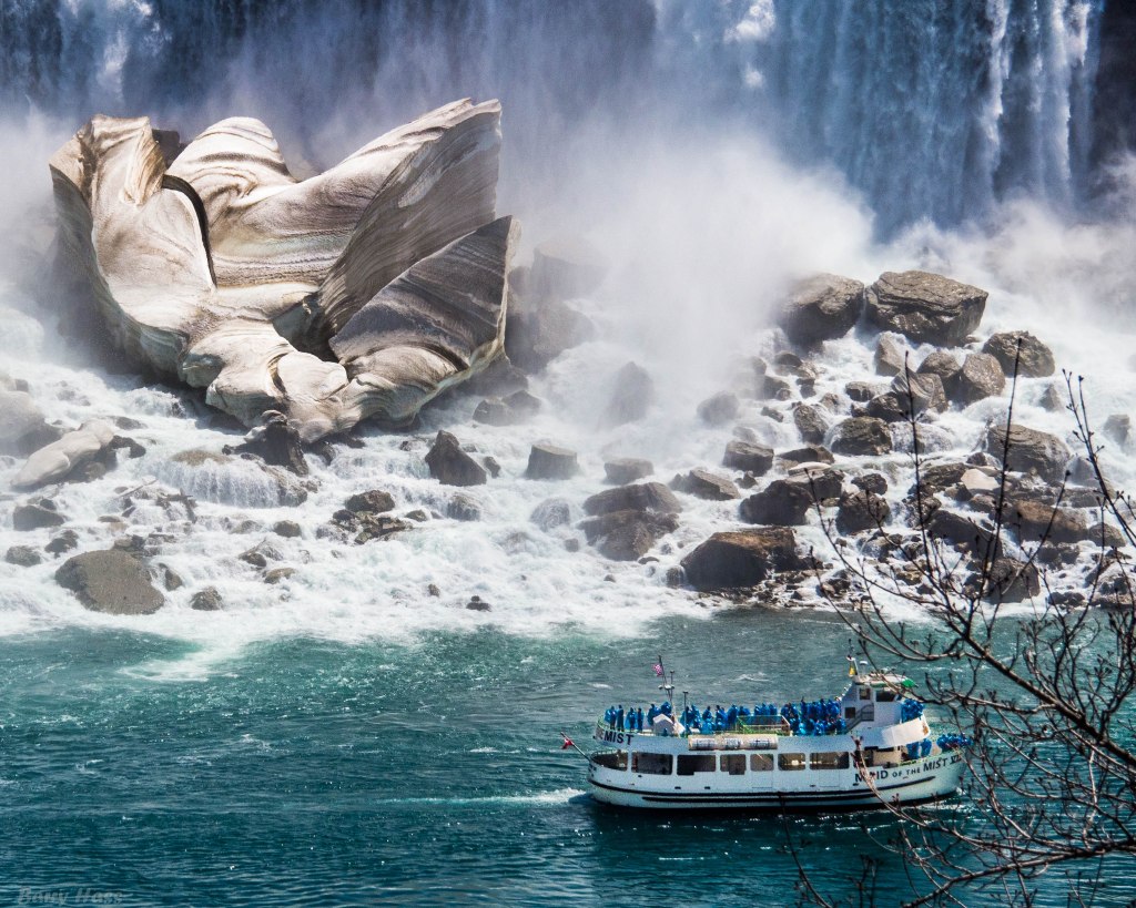 In the spring 0f 2015, on our way to visit relatives in Michigan, we stopped for a brief visit to Niagra Falls. Looking straight down from the Canadian side, we could see an ant-like crowd of people in yellow ponchos, waiting for a tour boat to take them to the base of the falls. A rainbow created by the sun shining through the mist from the river framed the scene.
