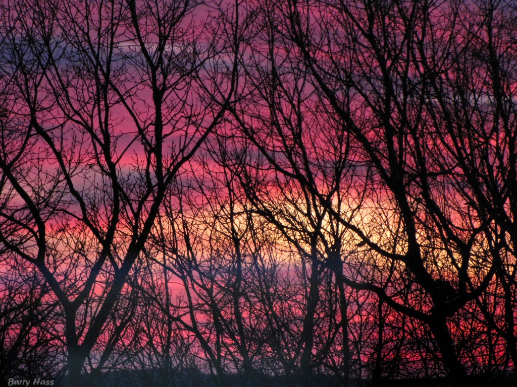 The setting sun cast the dried leaves clinging to this oak in a filigree pattern against the sky.