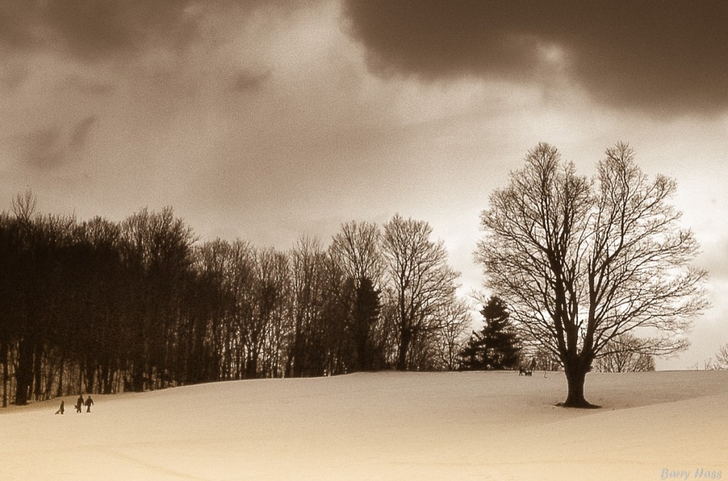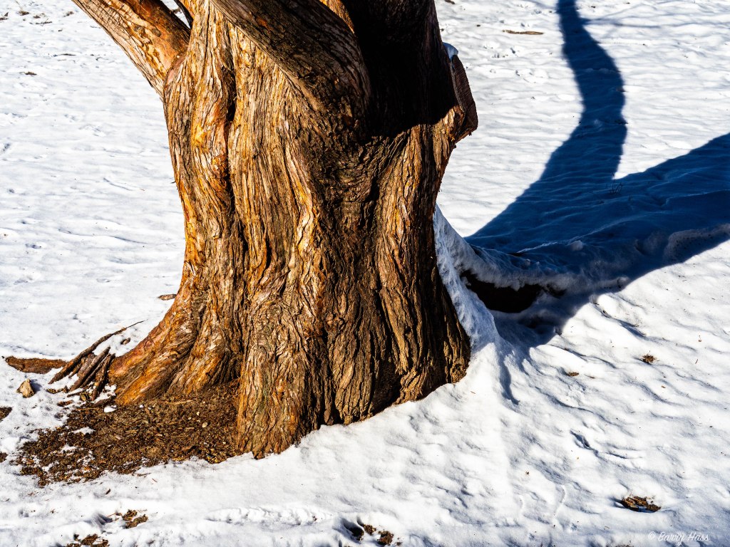 I took this a few weeks ago, when we had some snow on the ground. The golden hour sun on this tree trunk caught my eye.