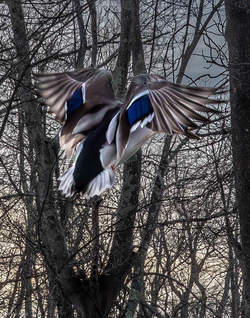 I was lucky enough to catch this guy showing off his coloration just at dusk. Although he appears to be headless, his head is hidden behind his body and right wing.